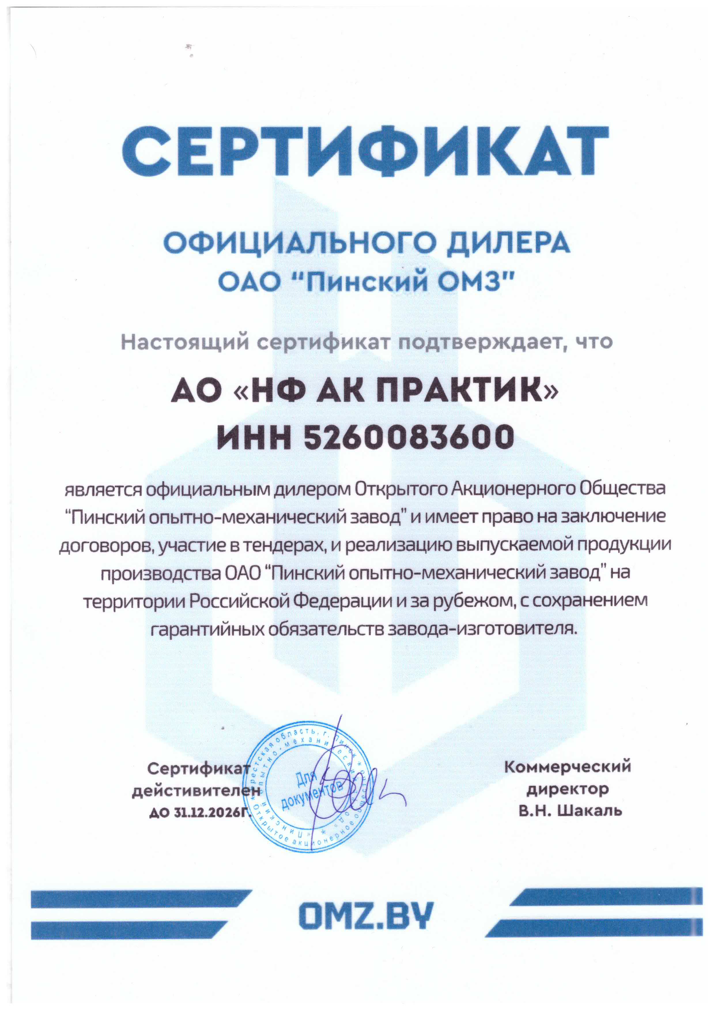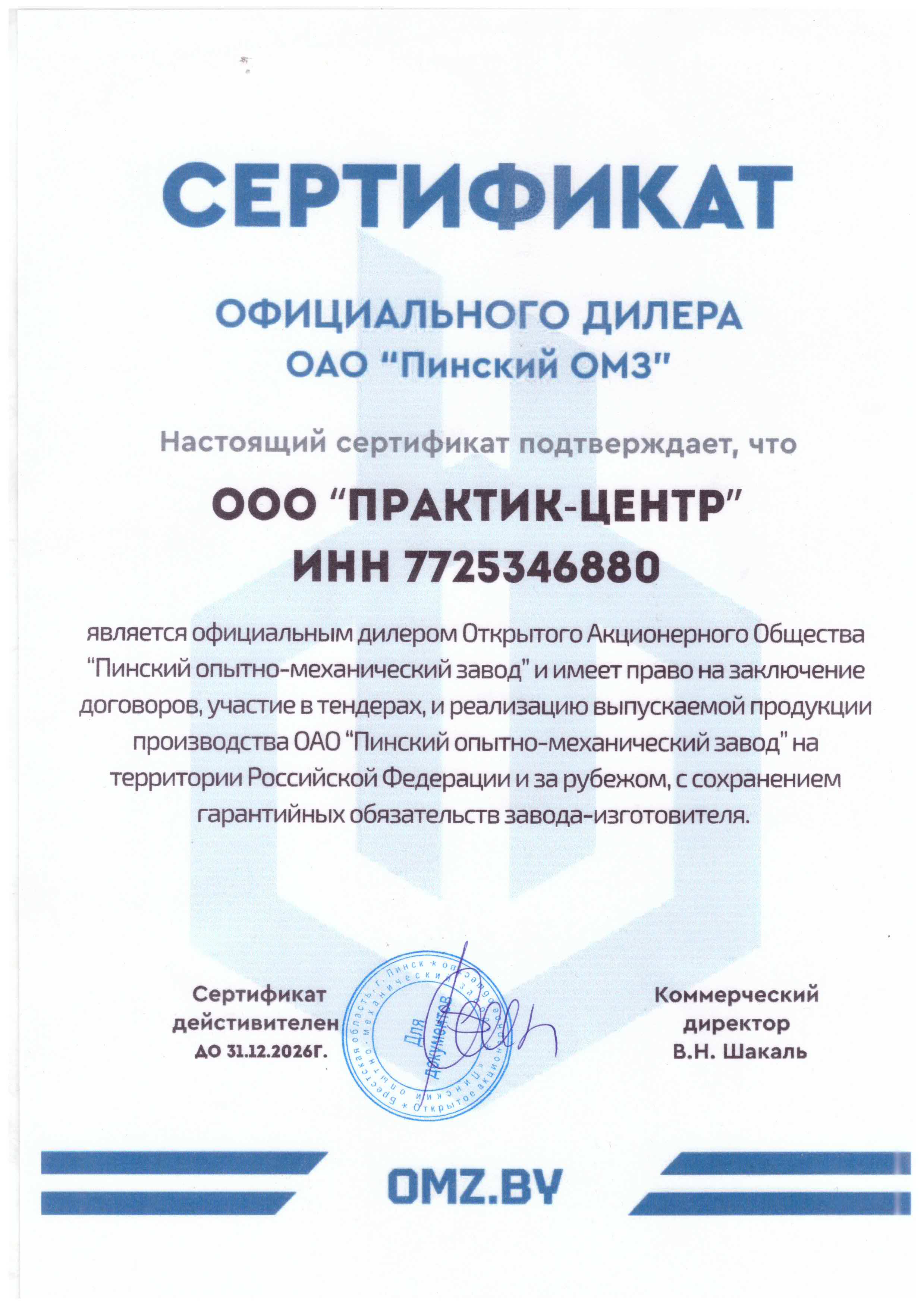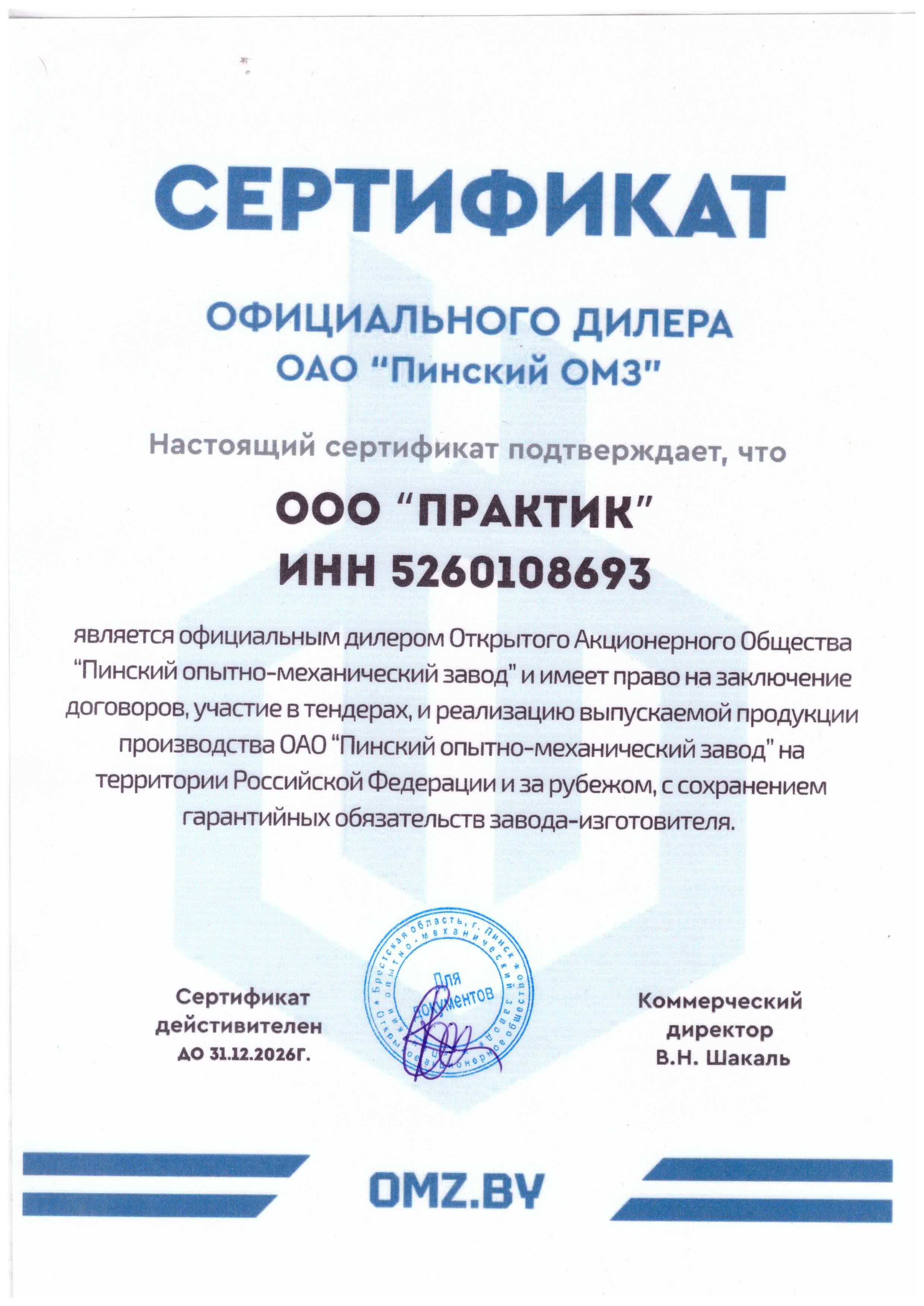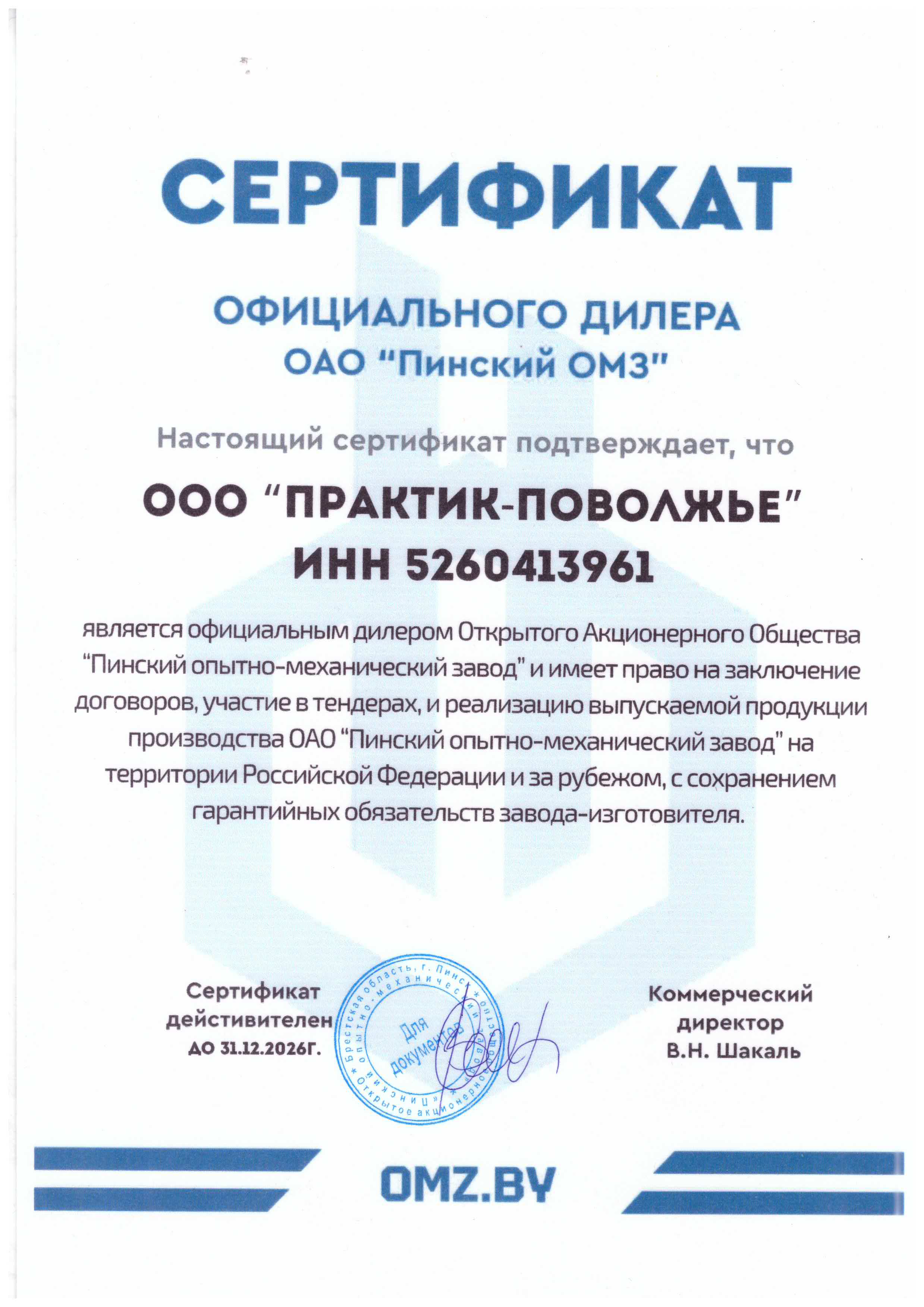 Сертификат дилера АО "Пинский опытно-механический завод"